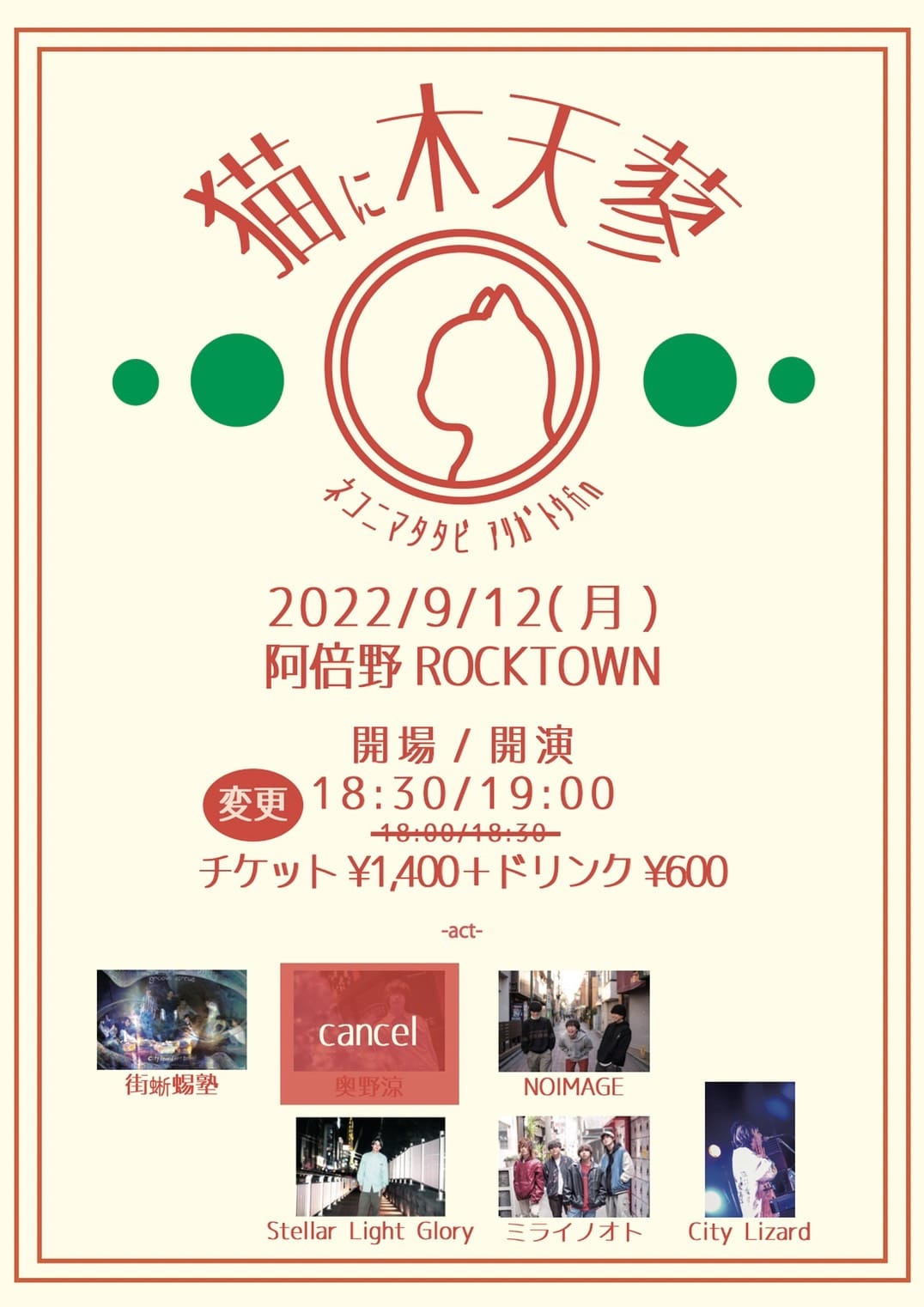 NOIMAGE / ミライノオト / City Lizard / 街蜥蜴塾 / Stellar Light Glory ※出演予定の奥野涼ですが、体調不良のためキャンセルとなります。 |