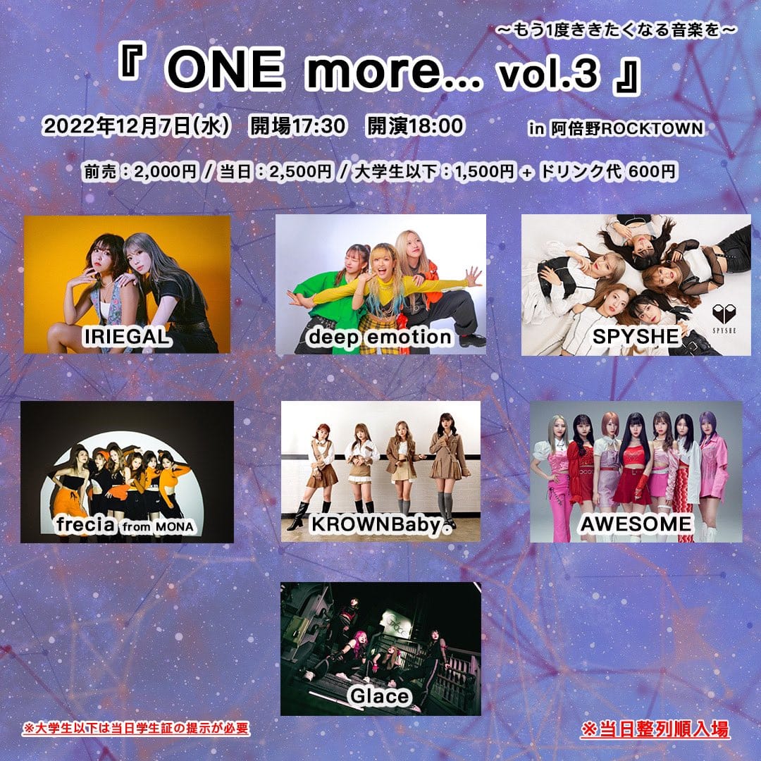 open 16:10 / start 16:40 Sチケット…6,000円(優先エリア/特典:定点DVD、集合チェキ券、ファストパス、コメントチェキ券、入特限定カットブロマイド5種) Aチケット…2,500円(特典:定点DVD) Bチケット…500円 手売りチケット(会場限定販売)…500円 当日券…500円 (各+1D)