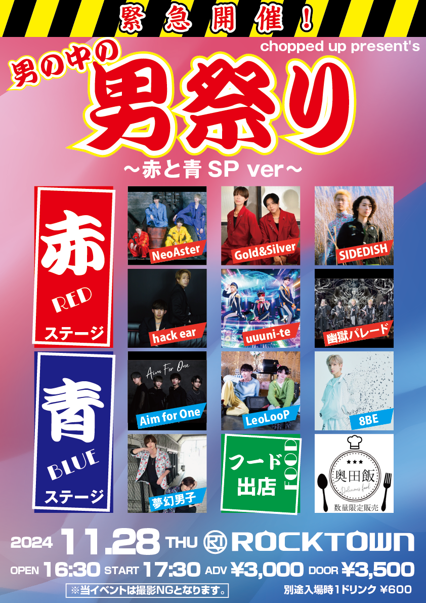 open 16:30 / start 17:30 adv ¥3,000 / door ¥3,500(D別¥600) 【チケット発売URL】 https://t.livepocket.jp/e/otokononakanootoko1128 |
